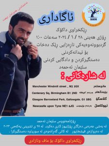 ڕێکخراوی داکۆک ئاگاداریی بڵاو کردۆتەوە : ڕۆژی هەینی ٢٨ / ٦ / ٢٠٢٤ لە شارەکانی بیرمینگهام ، مانچستەر ، نیوکاسڵ ، گڵاسگۆ خۆپیشاندان ڕێکدەخات دژ بە لە زیندان هێشتنەوەو دادگایی کردنی سلێمان ئەحمەد و داوا لە کوردانی بەریتانیا دەکات بەشداری بکەن .